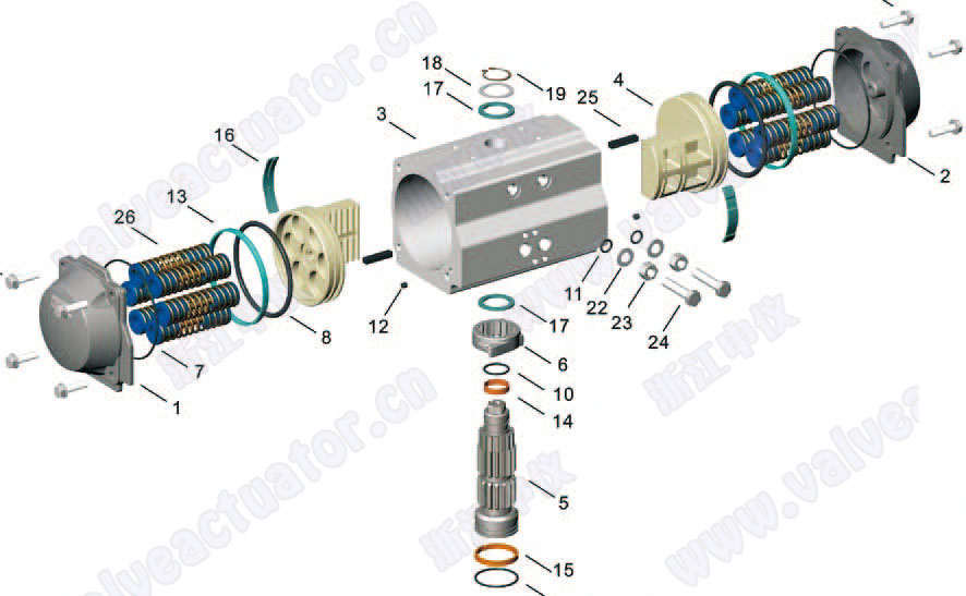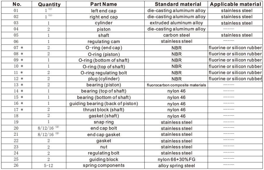3) The integrated design and same cylinders and end caps of different models of single-acting and double-acting actuators enable changing the acting mode simply by assembling springs or disassembling springs.