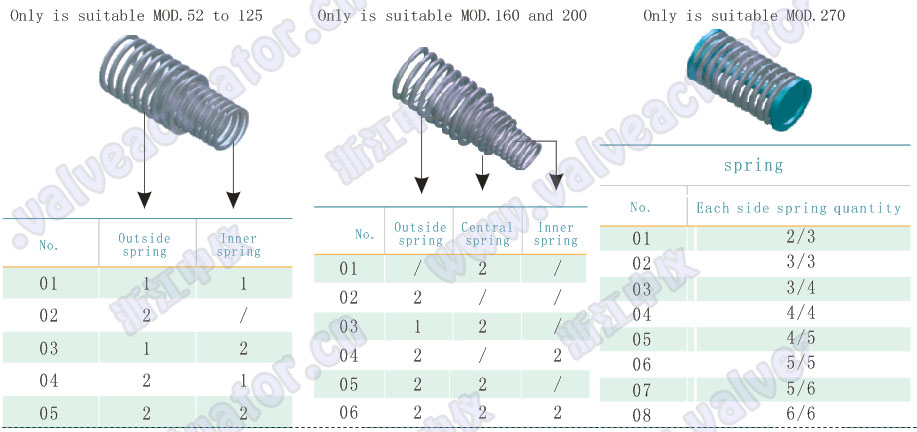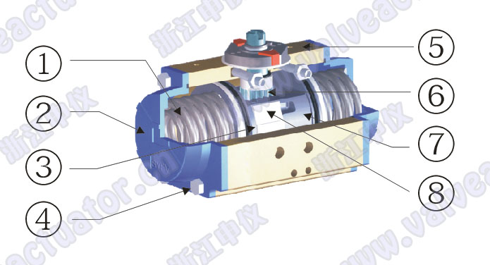 | ① | Spring | Concentric telescoped spring cartridge.The standard bonderizing, high elastic and the reliability, may adapt different barometric pressure and torque, the safe long bolt, when the guarantee service safely disassembles and assembles, the DA/SR series external dimensions is same. |